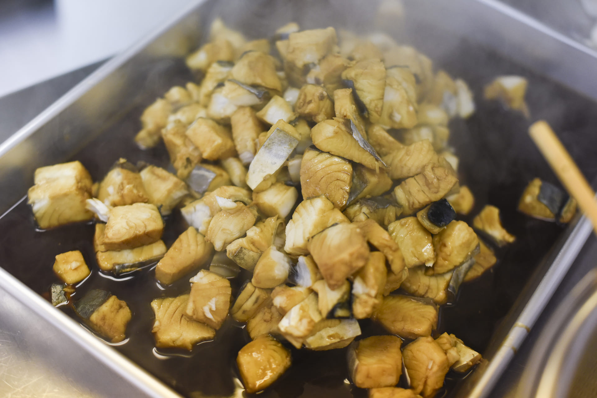 まず、三枚におろした鰆を一口サイズにカット。身に深く入っている中骨をはじめ丁寧に骨を取り除いていく。「小さいお子さんでも安心して食べられるように、骨は手でさわりながら丁寧に取り除いていきます。身にくっついている内臓の一部も、風味に影響するのできれいにしておかなければなりません」。カットされた身は醤油、酒、本みりん、出汁などを合わせた煮汁で炊いていく。温度を測りながら炊き終わったら冷ましてパック詰めするが、パック詰めの直前まで骨が残っていないかを細かく確認。最後まで丁寧な手作業が続いていく。