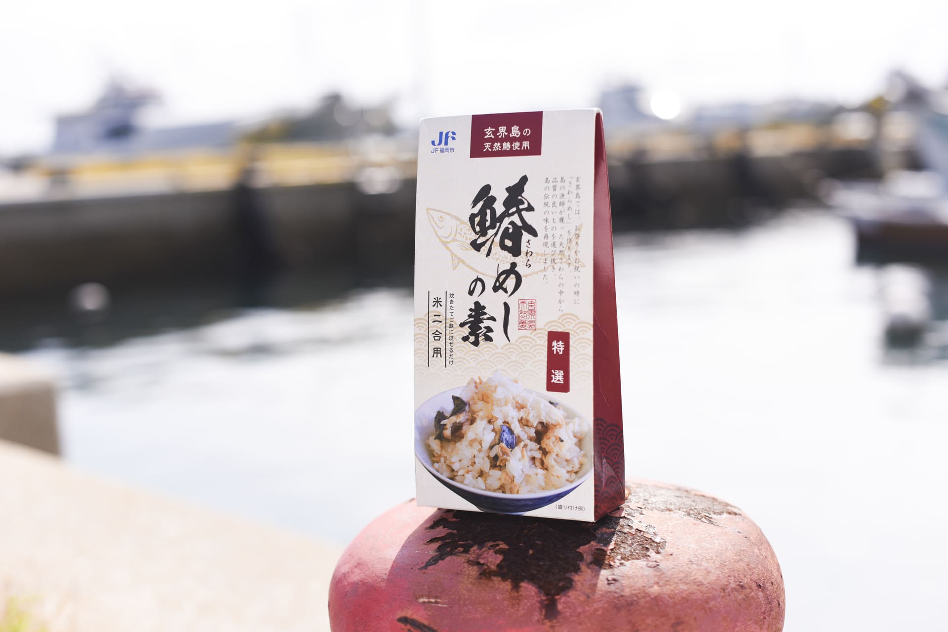 「ベイサイドプレイス博多ふ頭」から定期船で約35分。福岡市西区に浮かぶ玄界島は周囲約4kmの自然豊かな島。漁業が盛んで一年を通して多くの魚介類が水揚げされている島で、昔から愛されている味の一つが鰆を使った『鰆めし』。島の味を「名物」にまで高めて広げようと、鰆を8年ほど前から『鰆めしの素』に手作業で加工している。