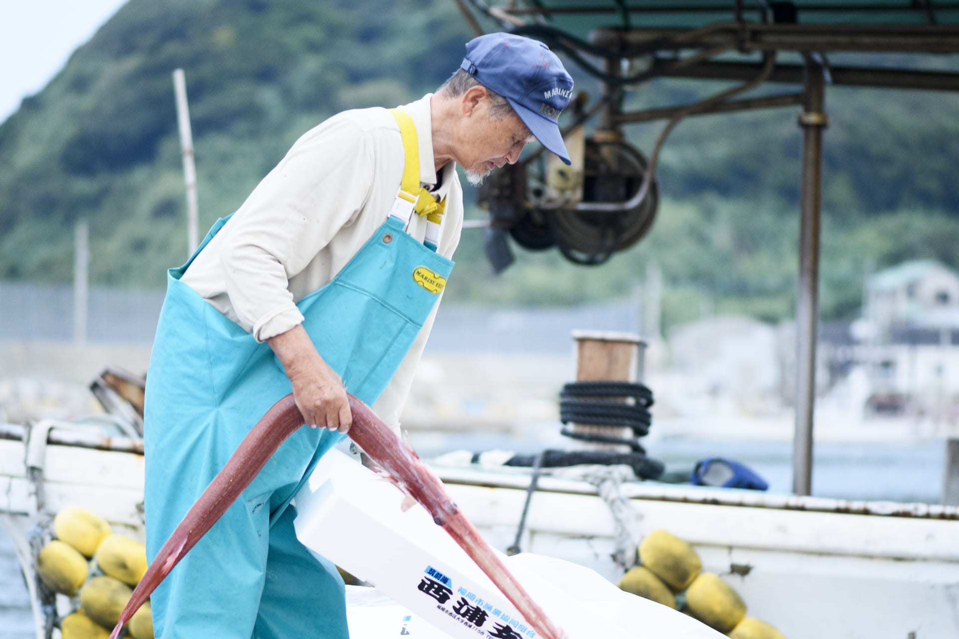 西浦地区では、2隻で操業する『2そうごち網漁』が主流。網の両側に繋いだワイヤーロープを「本船」と「片船(かたぶね)」と呼ぶ2隻の船で並走しながら、長い時で45分ほどかけて魚を網に追い込んでいく。本船で指揮を執る柴田勝善さん(73)は、漁師歴55年以上の大ベテラン。息子の勝也さん(41)が「片船」を操る。ロープの総延長は1500メートルほどになり、絶えず無線で連絡を取り合いながら、呼吸を合わせて進んでいく。ポイントも東は沖ノ島、西は壱岐の手前までと、広大な海の中から経験を元に決めなければならない。西浦の漁師たちは、こうしてともに漁をしながら高度な技術を継承してきたのだ。ベテラン漁師の勝善さんは、「何歳になっても一人前と言うことはない。漁師である限りずっと勉強」と語る。